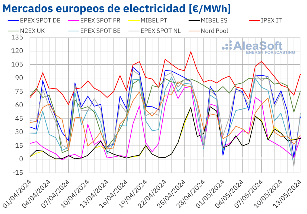 En la segunda semana de mayo, los precios de los principales mercados eléctricos europeos aumentaron respecto a la semana anterior. En la mayoría de los mercados, los precios más altos de la semana se alcanzaron el lunes 6 de mayo y durante la semana fueron bajando, por lo que gran parte de los días los precios fueron similares a los de las semanas anteriores. La excepción a las subidas en los precios semanales fue el mercado EPEX SPOT de Francia, con una caída del 17%. El mercado Nord Pool de los países nórdicos y el EPEX SPOT de Alemania alcanzaron las mayores subidas porcentuales de precios, del 12% y el 18%, respectivamente. En cambio, el mercado N2EX del Reino Unido registró el menor ascenso porcentual, del 1,4%. En el resto de los mercados analizados en AleaSoft Energy Forecasting, los precios subieron entre el 2,1% del mercado EPEX SPOT de los Países Bajos y el 11% del mercado MIBEL de Portugal.