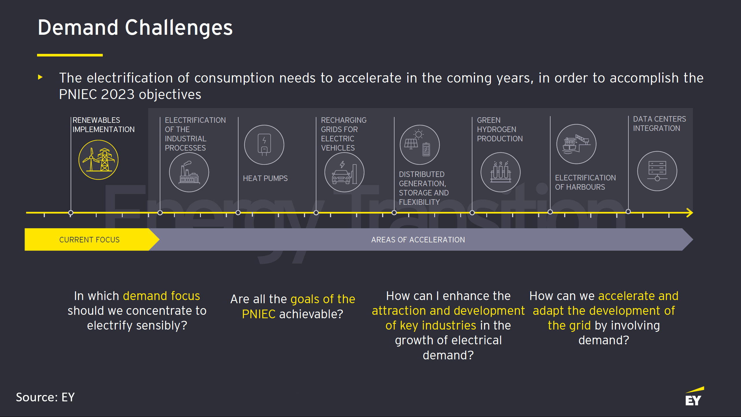Específicamente sobre el necesario impulso y crecimiento de la demanda de electricidad como uno de los objetivos clave para la descarbonización y la transición energética, los expertos de EY analizaron otros factores adicionales más allá de la electrificación de la industria. Entre los más importantes se encuentran la penetración de las bombas de calor para calefacción y refrigeración y el desarrollo de la red de carga de vehículos eléctricos.