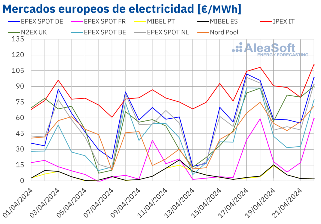 En la tercera semana de abril, los precios de la mayoría de mercados eléctricos europeos subieron, excepto en MIBEL, que tuvo los precios más bajos por undécima semana consecutiva. Los futuros de gas y CO2 subieron hasta precios que no se veían desde inicios de enero. Una mayor demanda también favoreció las subidas de precios. En la península ibérica la producción renovable aumentó ayudando a las caídas de precios. El 19 de abril en España se alcanzó la mayor producción fotovoltaica para un mes de abril.