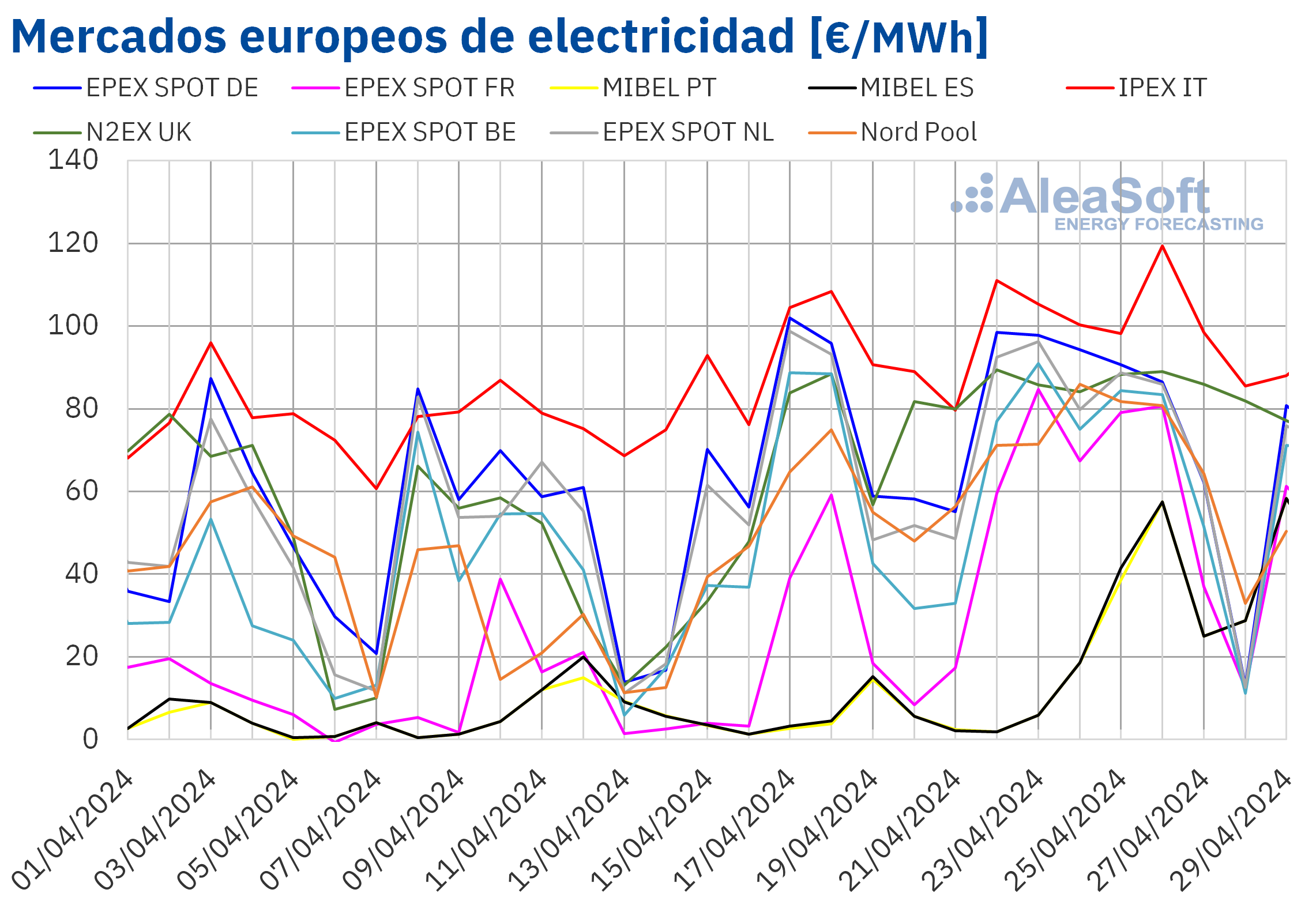 En la cuarta semana de abril, los precios de los principales mercados eléctricos europeos aumentaron respecto a la semana anterior. El mercado EPEX SPOT de Francia y el mercado MIBEL de España y Portugal, alcanzaron las mayores subidas porcentuales, del 181%, el 402% y el 419%, respectivamente. En cambio, el mercado EPEX SPOT de Alemania registró el menor incremento porcentual, del 9,3%. En el resto de los mercados analizados en AleaSoft Energy Forecasting, los precios aumentaron entre el 12% del mercado IPEX de Italia y el 32% del mercado EPEX SPOT de Bélgica.