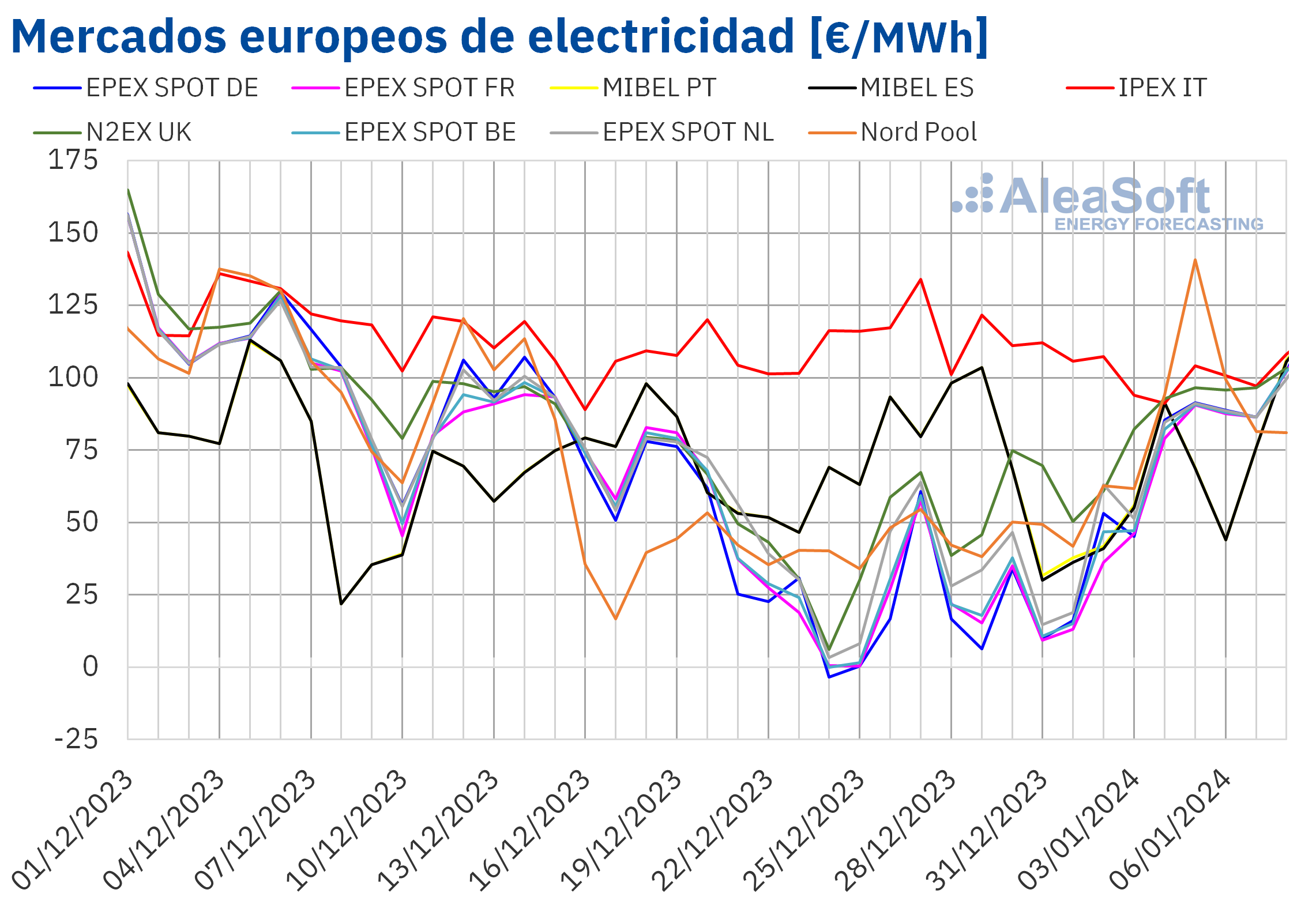 Durante la semana del 1 de enero, el aumento generalizado de la demanda eléctrica propició el incremento de los precios en los mercados eléctricos europeos. La caída de la producción solar en países como Alemania o Francia y el descenso de la producción eólica alemana también contribuyeron a los incrementos de precios. Sin embargo, la importante subida de la producción eólica en Italia y en la península ibérica favoreció el descenso de los precios en estos mercados.