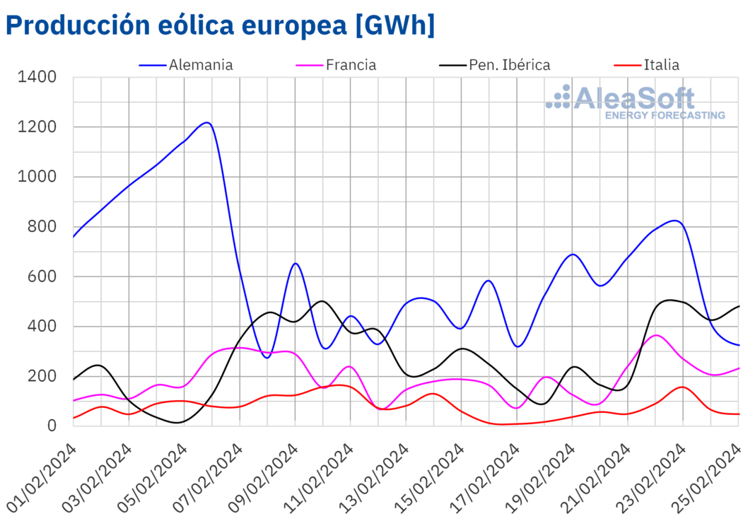 Para la semana del 26 de febrero, las previsiones de producción eólica de AleaSoft Energy Forecasting indican que la tendencia creciente continuará en España e Italia y se revertirá en Alemania, Francia y Portugal.