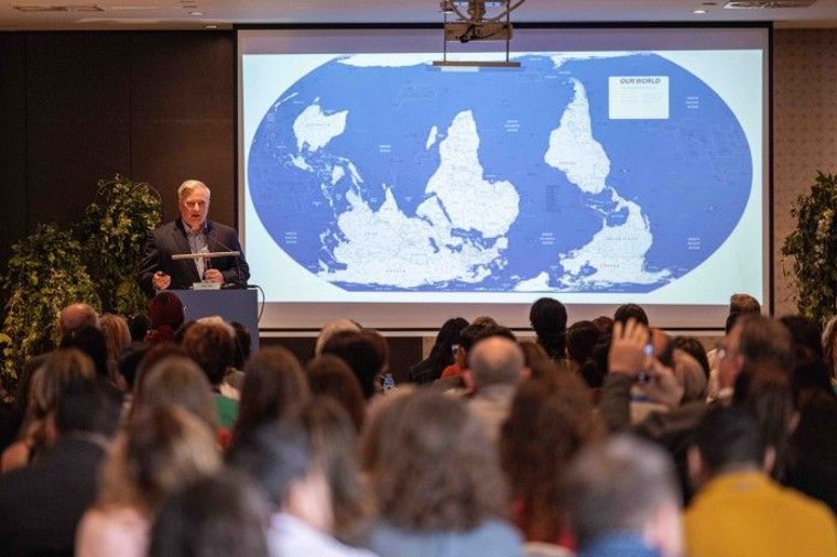 El ex embajador de EE.UU contra la trata de personas y CIO de Atlas Free, John Richmond, destaca la importancia de adoptar diferentes perspectivas antes de dirigirse a más de 100 líderes, usando un mapa al revés como metáfora.