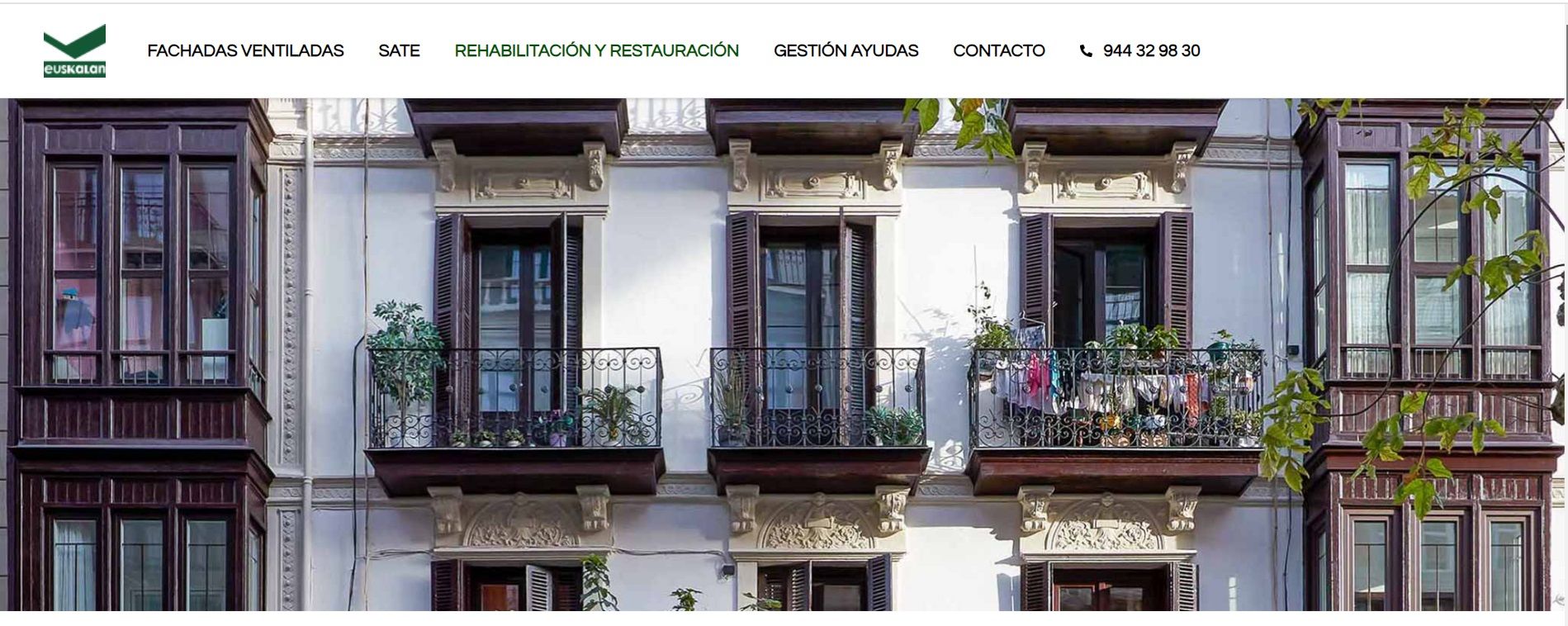 La nueva página web de Euskalan se estructura en torno a sus principales servicios: rehabilitación y restauración de edificios e intervenciones para la mejora de la eficiencia energética con la instalación de Sistemas de Aislamiento Térmico por el Exterior, SATE, o fachadas ventiladas.