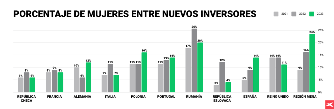 El estudio elaborado por XTB pone también de manifiesto que existen variaciones significativas en la participación de las mujeres entre diferentes países y regiones, lo que puede reflejar diferencias culturales, económicas y en las políticas de inclusión financiera. Países como Polonia, Portugal o regiones como MENA muestran incrementos más pronunciados en la participación femenina con respecto a España. Así, por ejemplo, en el mismo periodo, Polonia ha pasado del 6,9% al 13,1% y Portugal del 6,9% al 12,3%. Por su parte, Rumanía y la región MENA destacan por tener los incrementos más significativos, con Rumanía alcanzando un 19,8% y MENA un 18,2% en 2023, lo que podría reflejar políticas específicas de inclusión financiera o cambios culturales en la percepción de la inversión entre las mujeres.