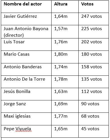 La lista incluye más de 70 nombres. Llama la atención la diferencia de votos entre los diez primeros del ranking (que suman entre 45 y 247 votos) y el resto, con menos de 40. Incluso teniendo en cuenta que muchos de los que están más abajo del ranking miden menos que otros en los primeros puestos, se observa una cierta correlación entre la popularidad y la altura. Se podría concluir que los encuestados quieren hacer más altos a sus actores favoritos, independientemente de que ya superen la estatura media de los españoles: 1,76 metros.