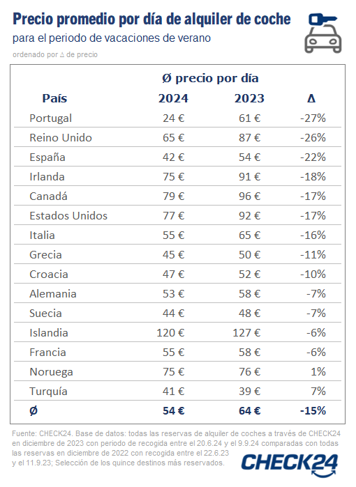 ¹Fuente / base de datos: todas las reservas de alquiler de coches a través de CHECK24 en diciembre de 2023 con periodo de recogida entre el 22.6.23 y el 11.9.23 (vacaciones de verano de 2023) comparadas con todas las reservas de alquiler de coches a través de CHECK24 en diciembre de 2023 con periodo de recogida entre el 20.6.24 y el 9.9.24 (vacaciones de verano de 2024); selección de los quince destinos más reservados.