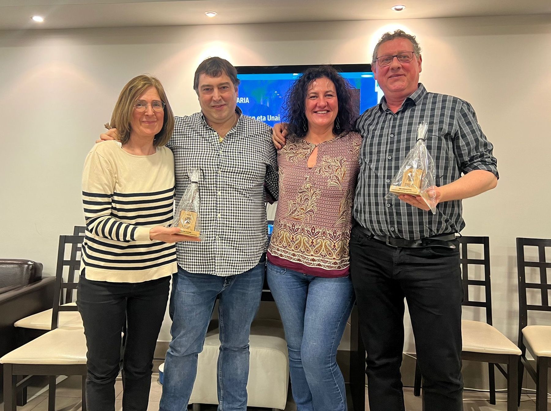 Ambos recogieron el galardón de manos del presidente de la asociación, Ibon Mokoroa, en el transcurso de la asamblea general de la entidad celebrada en Irurtzun (Navarra). El Premio, una escultura con forma de llama, es obra del artista guipuzcoano Iñigo Aristegui con una inscripción especial que agradece a ambos boticarios su empeño «por mantener viva la llama del euskera en la farmacia» («euskararen sugarra farmazian bizirik mantentzeagatik»).