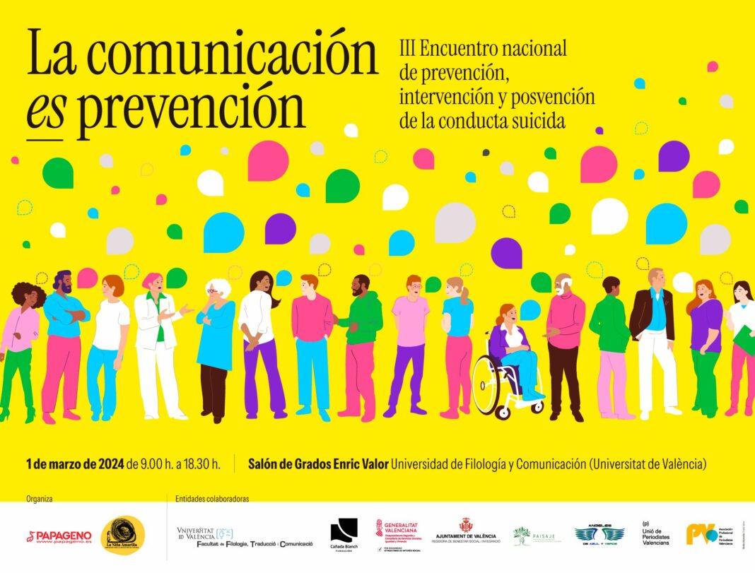 La prevención del suicidio es una responsabilidad social que requiere la participación activa de toda la sociedad. En 2022, según los últimos datos del INE, fallecieron por suicidio 4.227 personas en España y una media de 11,2 personas al día. En la Comunitat Valenciana los suicidios aumentaron un 10 %, al registrarse un total de 446 más que el año anterior. Estas cifras suponen un aumento del número de muertes por suicidio totales del 5,6 % respecto a las cifras del 2021. En este contexto, la Asociación Nacional de Profesionales para la Prevención, Intervención y Posvención del Suicidio Papageno.es y la asociación valenciana La Niña Amarilla para la Prevención del Suicidio desde la Comunicación, se han unido para organizar el III Encuentro Nacional de Prevención, Intervención y Posvención de la Conducta Suicida. El evento, que se celebrará el viernes, 1 de marzo, en el Saló de Graus de la Facultad de Filología, Comunicació i Traducció de la Universitat de València, tiene como lema «La comunicación es prevención».